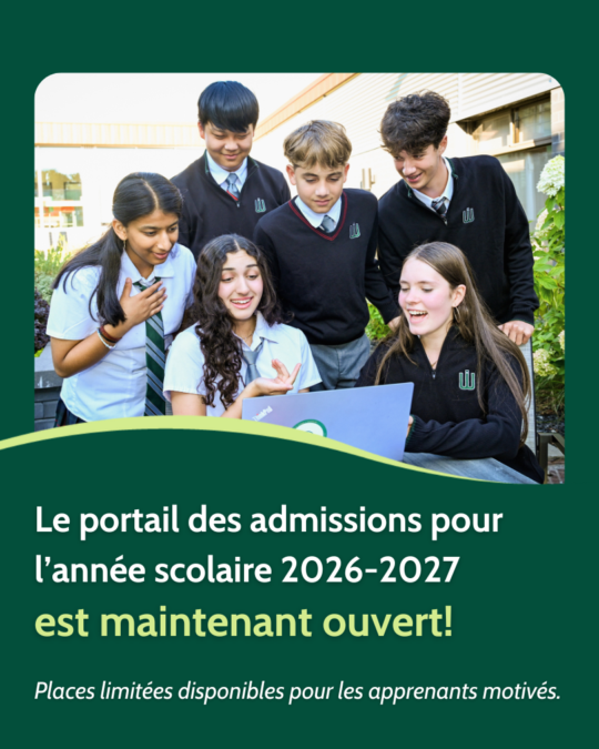 Le portail d’admission pour l’année scolaire 2027-2028 ouvrira le 1er juillet 2026. En attendant, cliquez ci-dessous pour en savoir plus sur le processus d’admission unique du Collège de l’Ouest de l’Île.